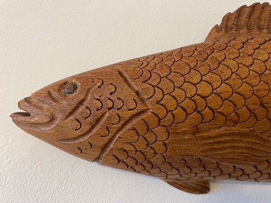 Vintage Teak Wood Bass Fish Wall Hanging – Hand Carved Wooden Nautical Coastal Decor – 43cm Mid-Century Style