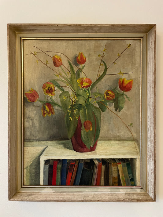 Vintage Original Oil Painting of Spring Tulips & Forsythia on Bookshelf – Framed Floral Still Life