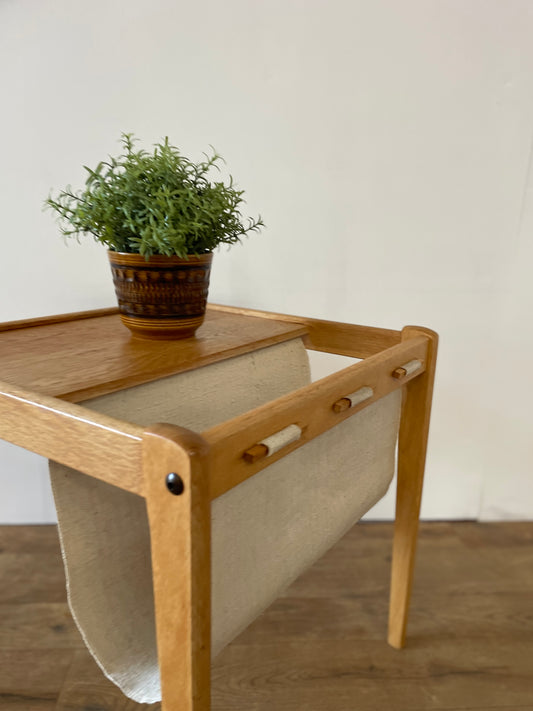 Mid-Century Danish Oak & Fabric Magazine Rack Side Table by BRDR Furbo | Scandinavian Modern 1960s