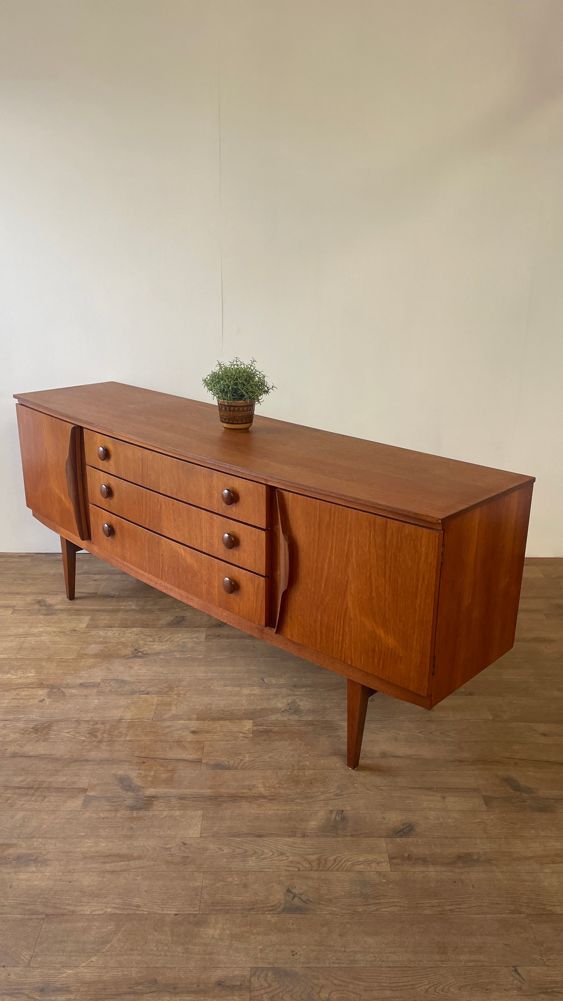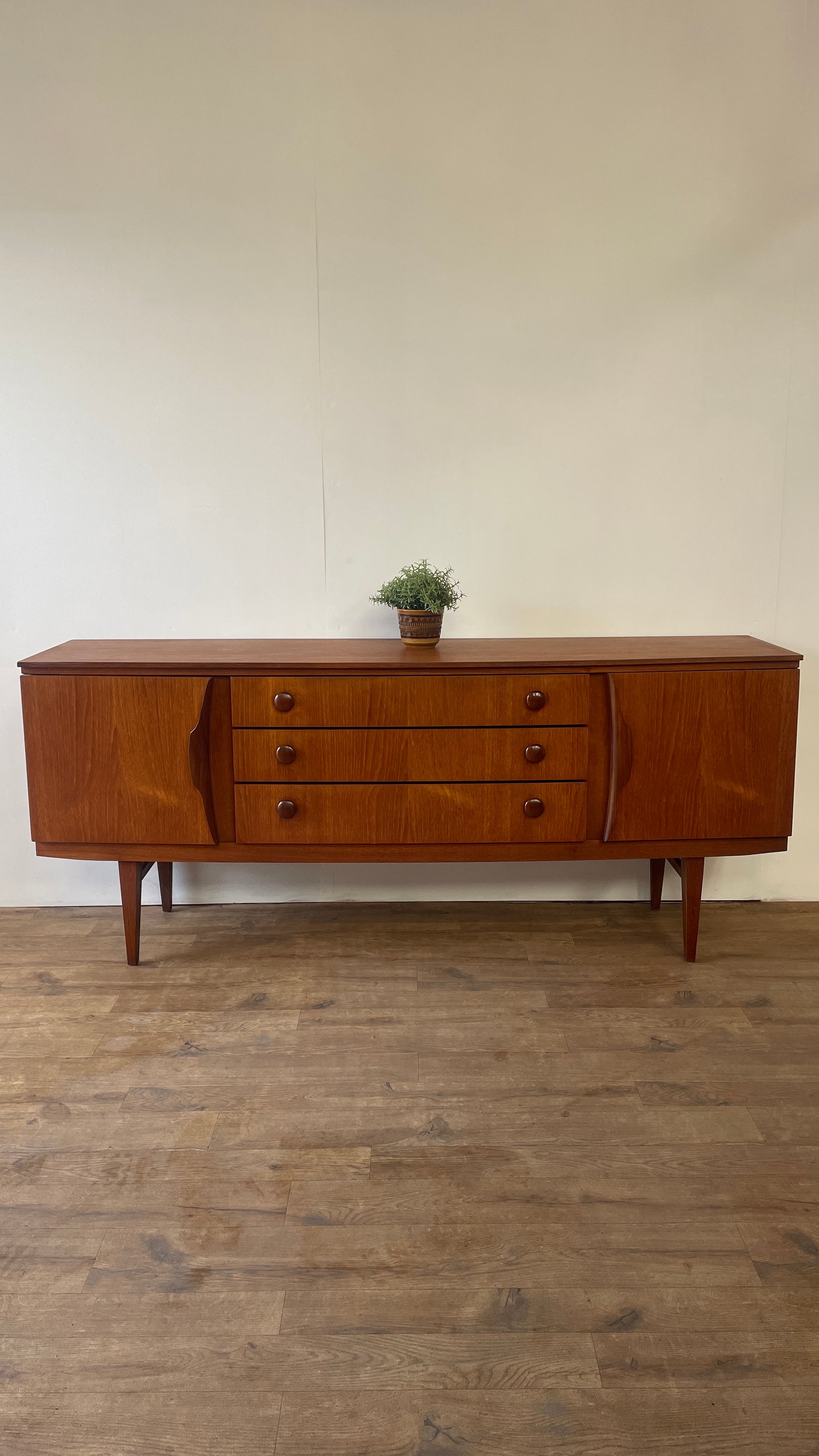 This beautifully proportioned mid-century teak sideboard by Beautility is a classic example of British modernist furniture from the 1960s. Crafted in warm, figured teak, the design balances clean Scandinavian influence with distinctive British detailing, most notably the sculpted teak handles and elegant tapered legs.