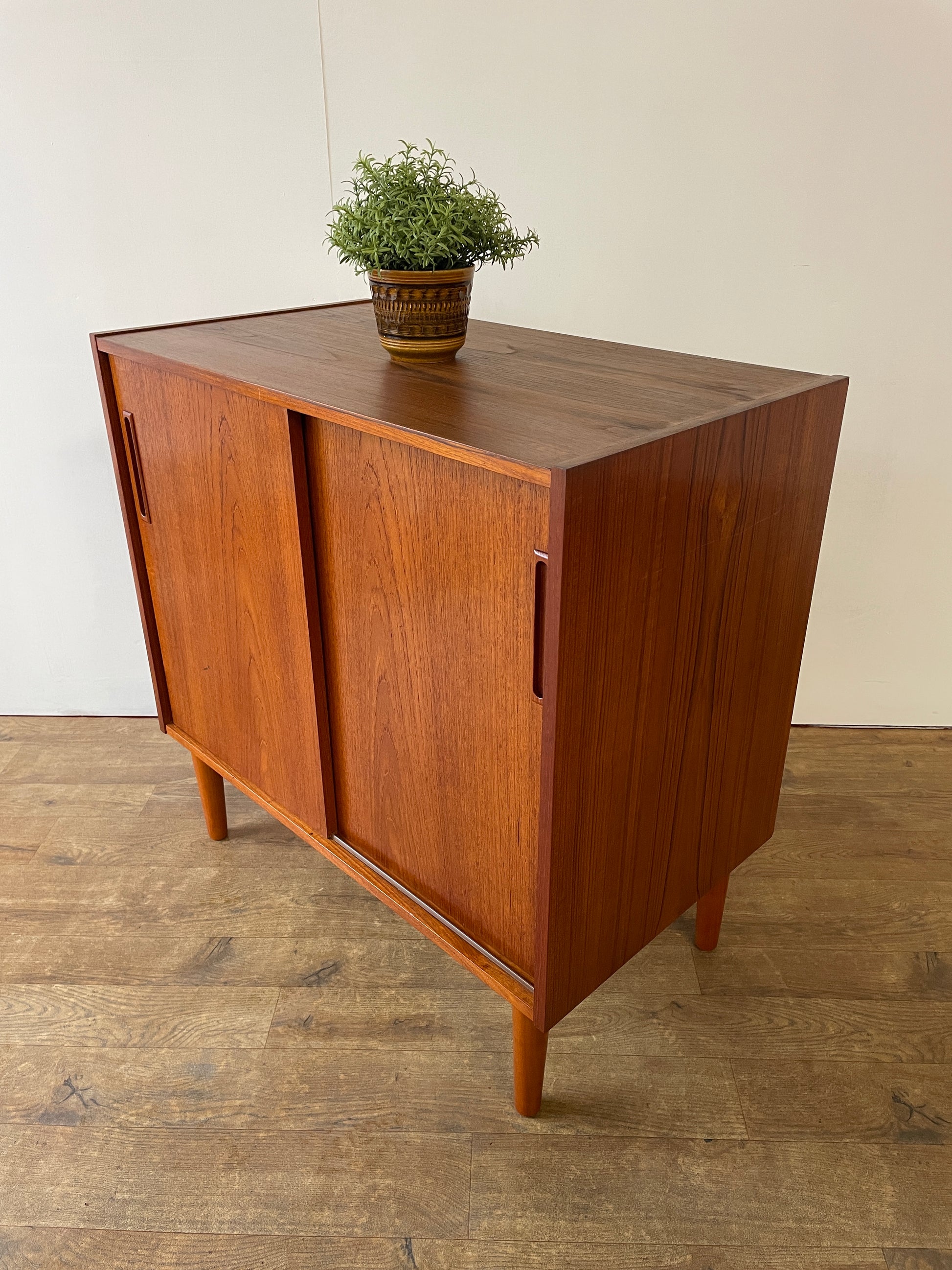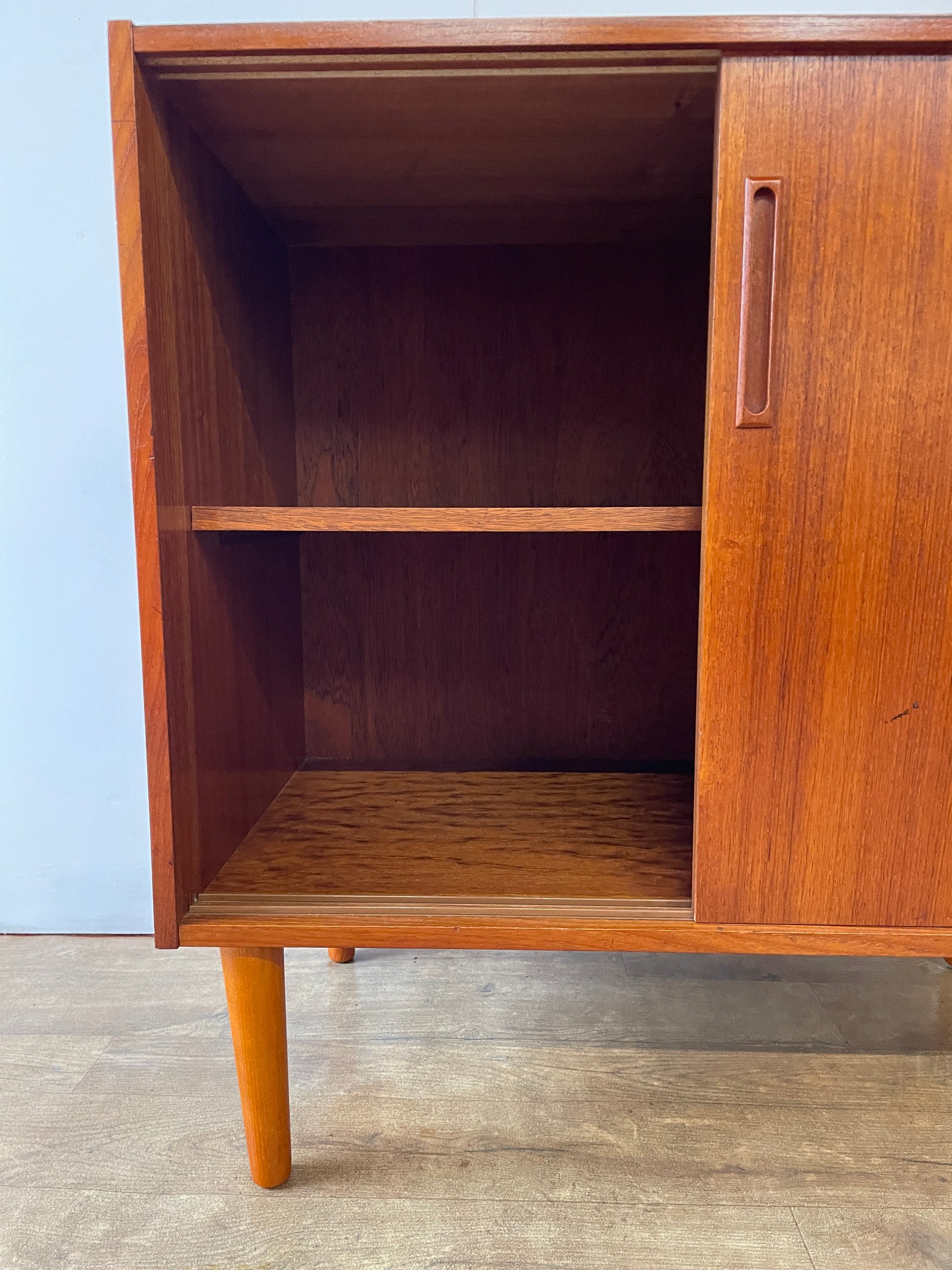 Measuring 80cm wide x 80cm high x 45cm deep, the cabinet offers versatile storage within a compact footprint. Behind the smooth sliding doors sits a practical internal shelf, ideal for storing records, books, tableware, or home accessories. The rich teak grain is well-matched throughout, with a warm, mellow tone that adds depth and character to any interior.