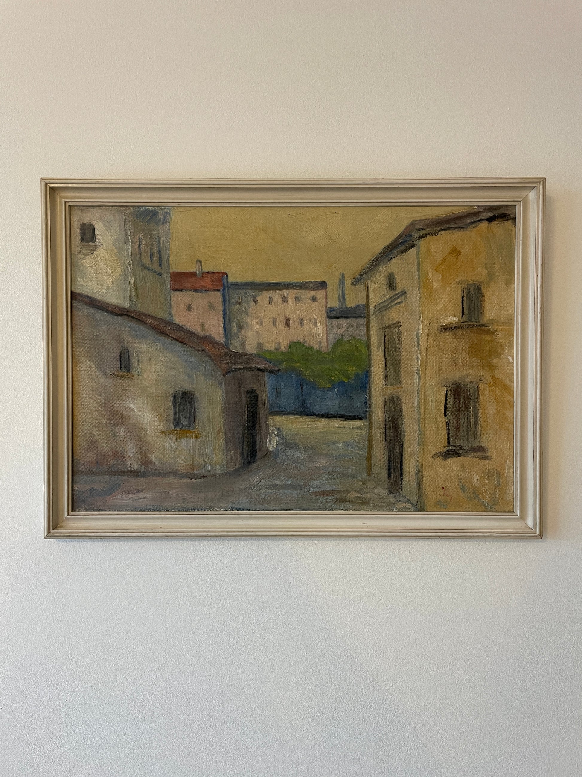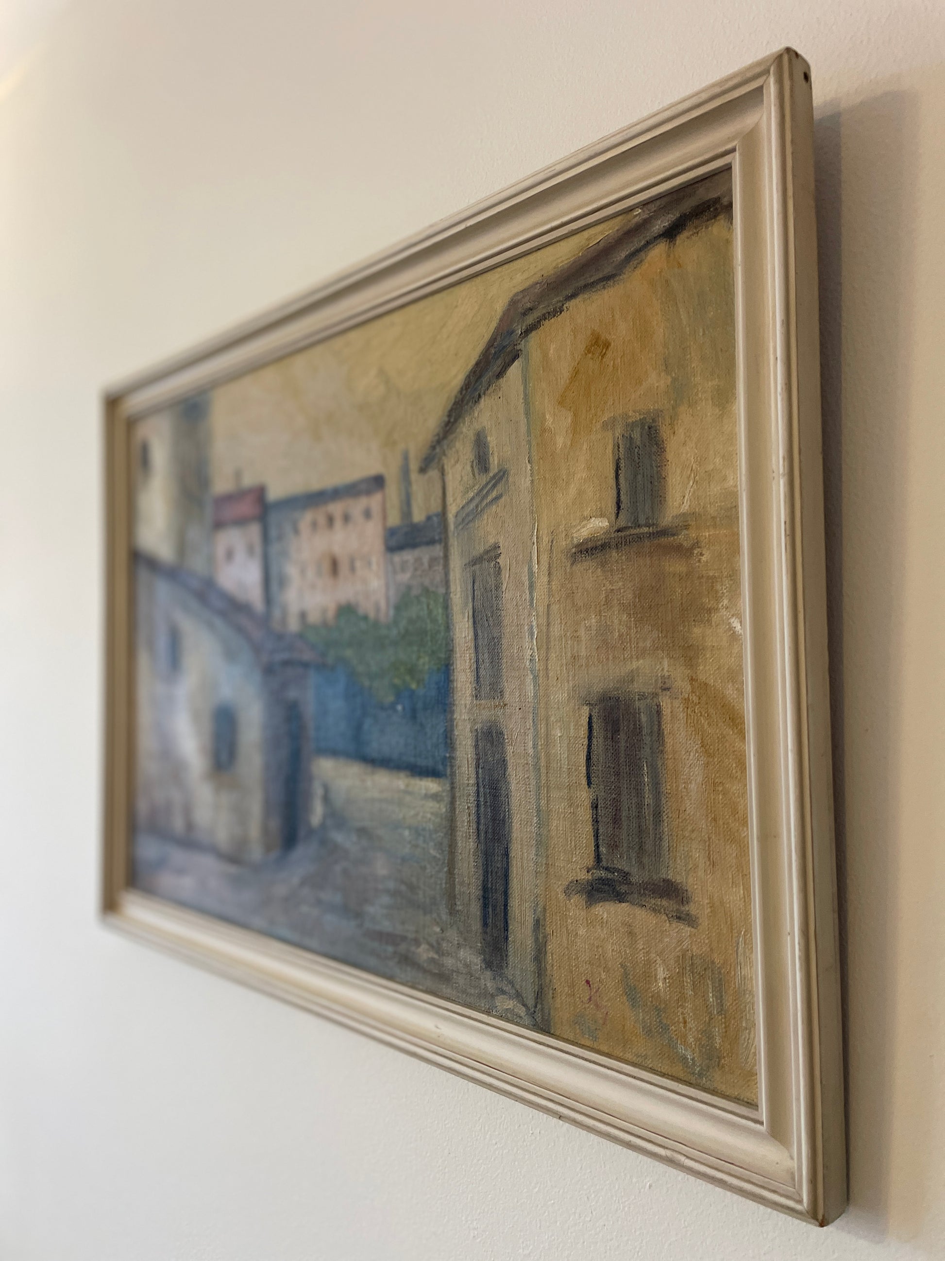 This atmospheric vintage original oil painting depicts a tranquil Mediterranean town street scene, rich with character and understated charm. Executed in oil on canvas, the composition captures sun-washed façades, narrow streets and soft architectural forms, evoking the quiet beauty of southern European village life. A warm, muted palette of ochres, creams and soft blues gives the piece a timeless, painterly quality that works beautifully within both modern and mid-century interiors.