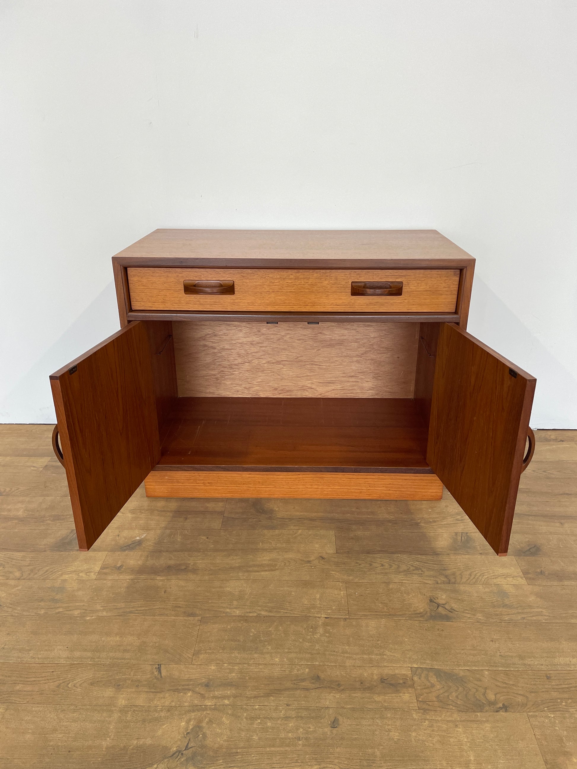 A beautifully crafted mid-century teak sideboard from G Plan’s iconic Sierra range, made in Britain during the 1960s–70s. Compact and practical, this vintage piece measures 84 cm wide × 46 cm deep × 69 cm high, making it perfect for living rooms, hallways, or stylish home offices. Constructed from rich teak veneer with elegant handles and distinctive panelled doors, it offers both a spacious drawer and a double-door cupboard for versatile storage. The piece is clearly labelled inside and remains in good vintage condition with light wear consistent with age. Its warm tones and timeless design make it a standout example of classic British modernism. Ideal for collectors, mid-century enthusiasts, or anyone seeking functional retro charm. UK-wide delivery and collection available.