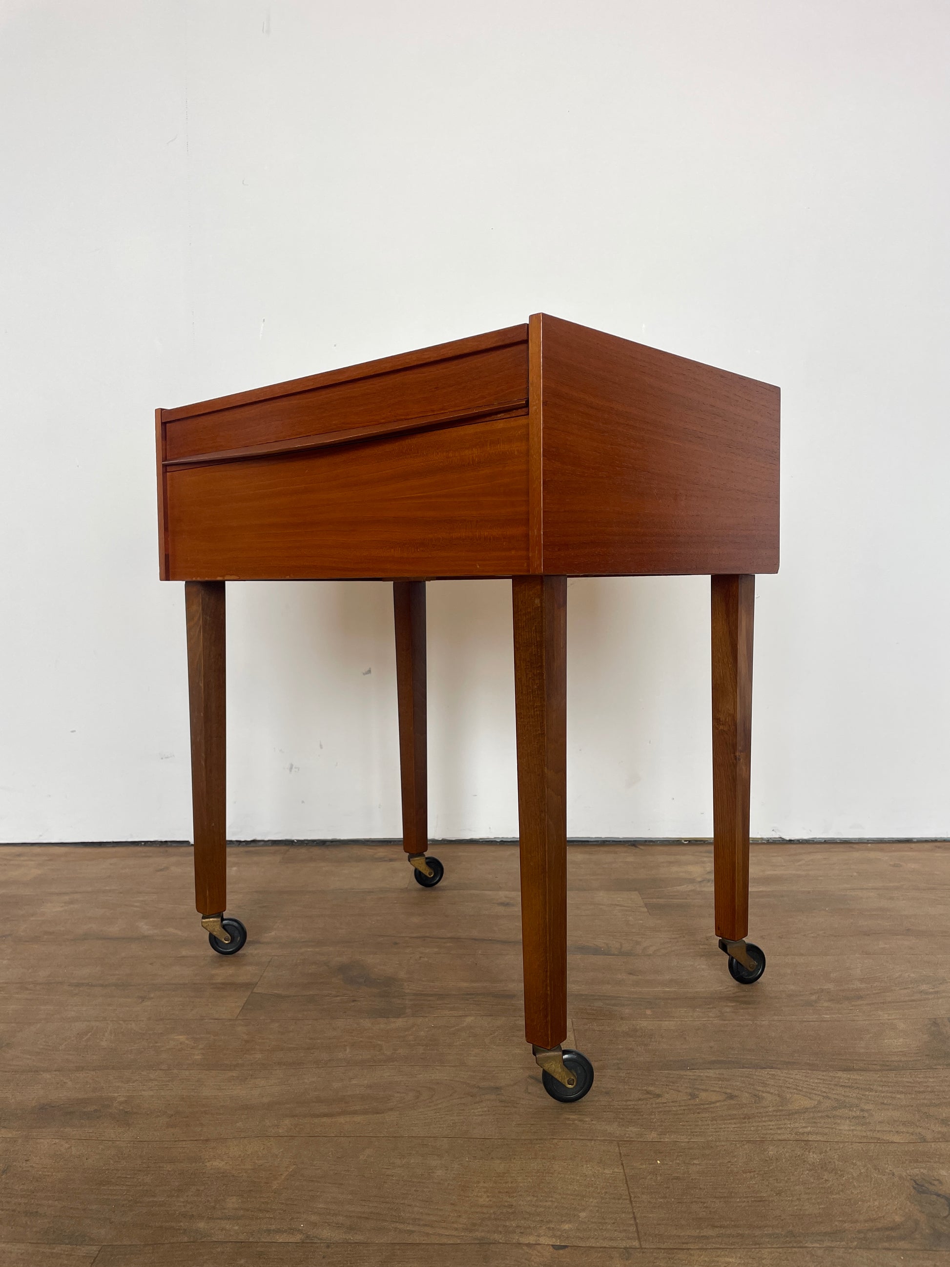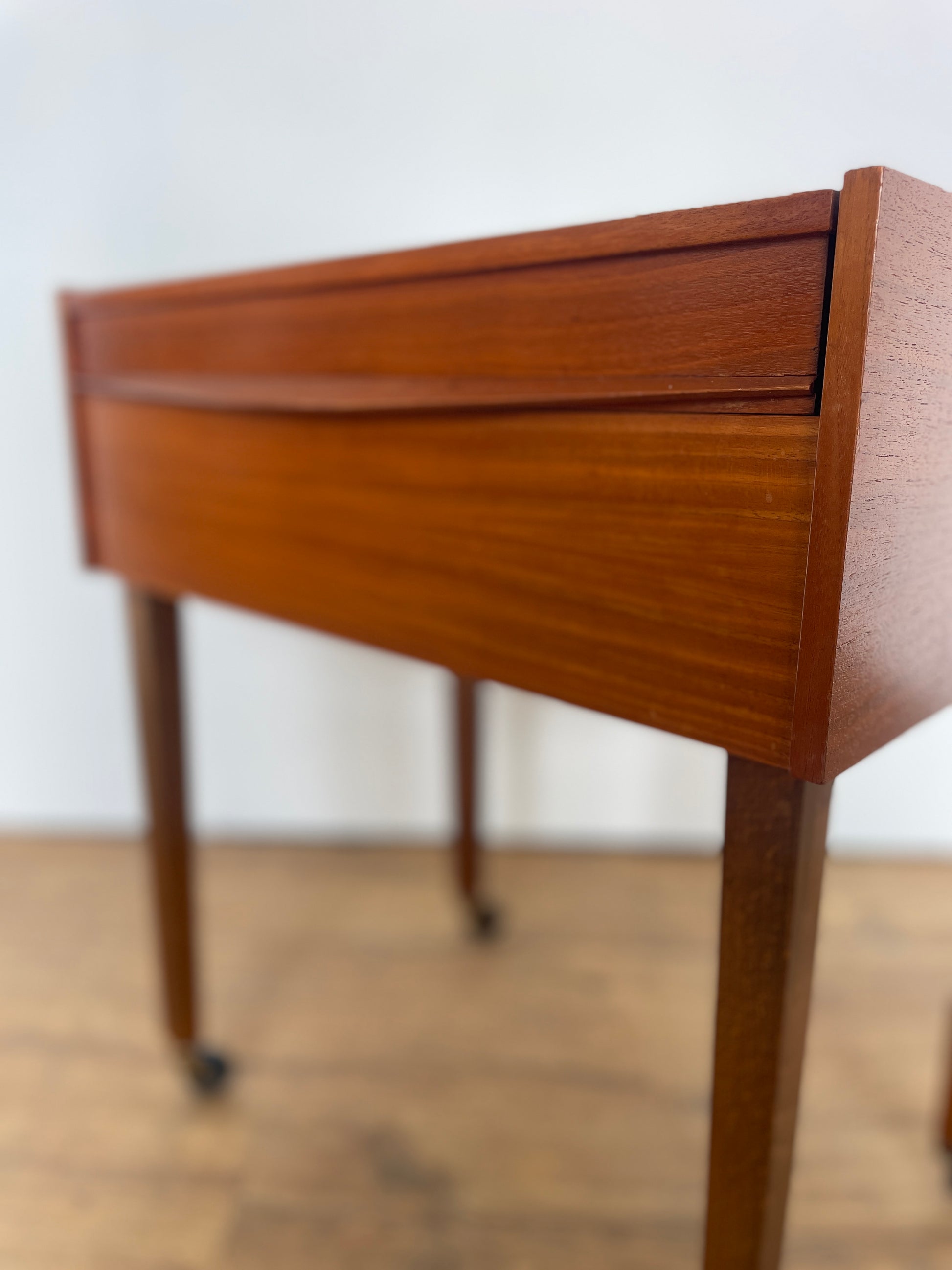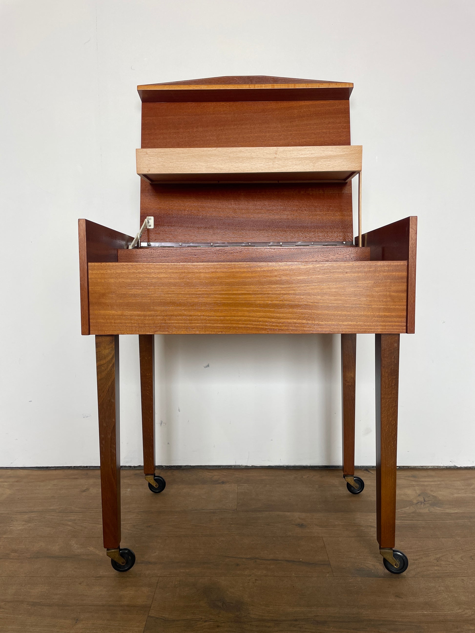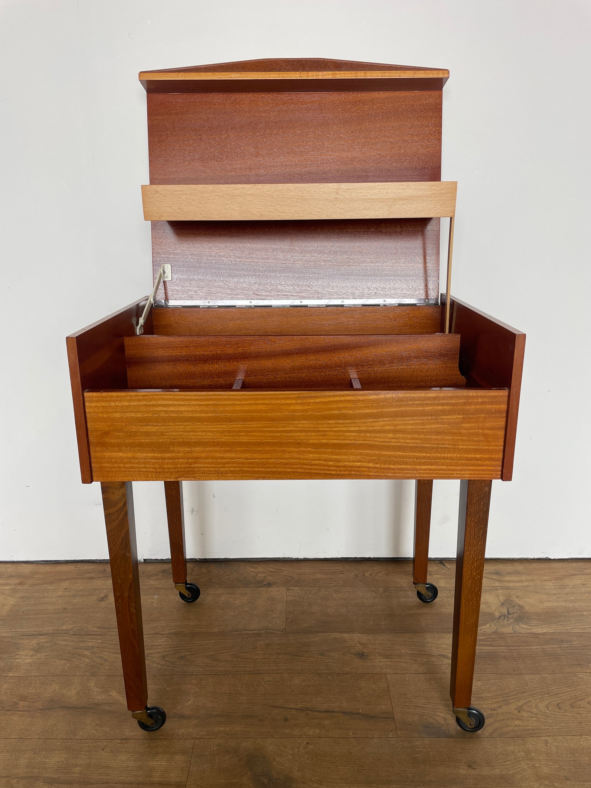Discover a stunning example of mid-century German craftsmanship with this elegant wooden sewing and craft box. Raised on slender legs and featuring smooth-rolling castors, this practical yet stylish piece is perfect for storing sewing supplies, art materials, or small collectibles.