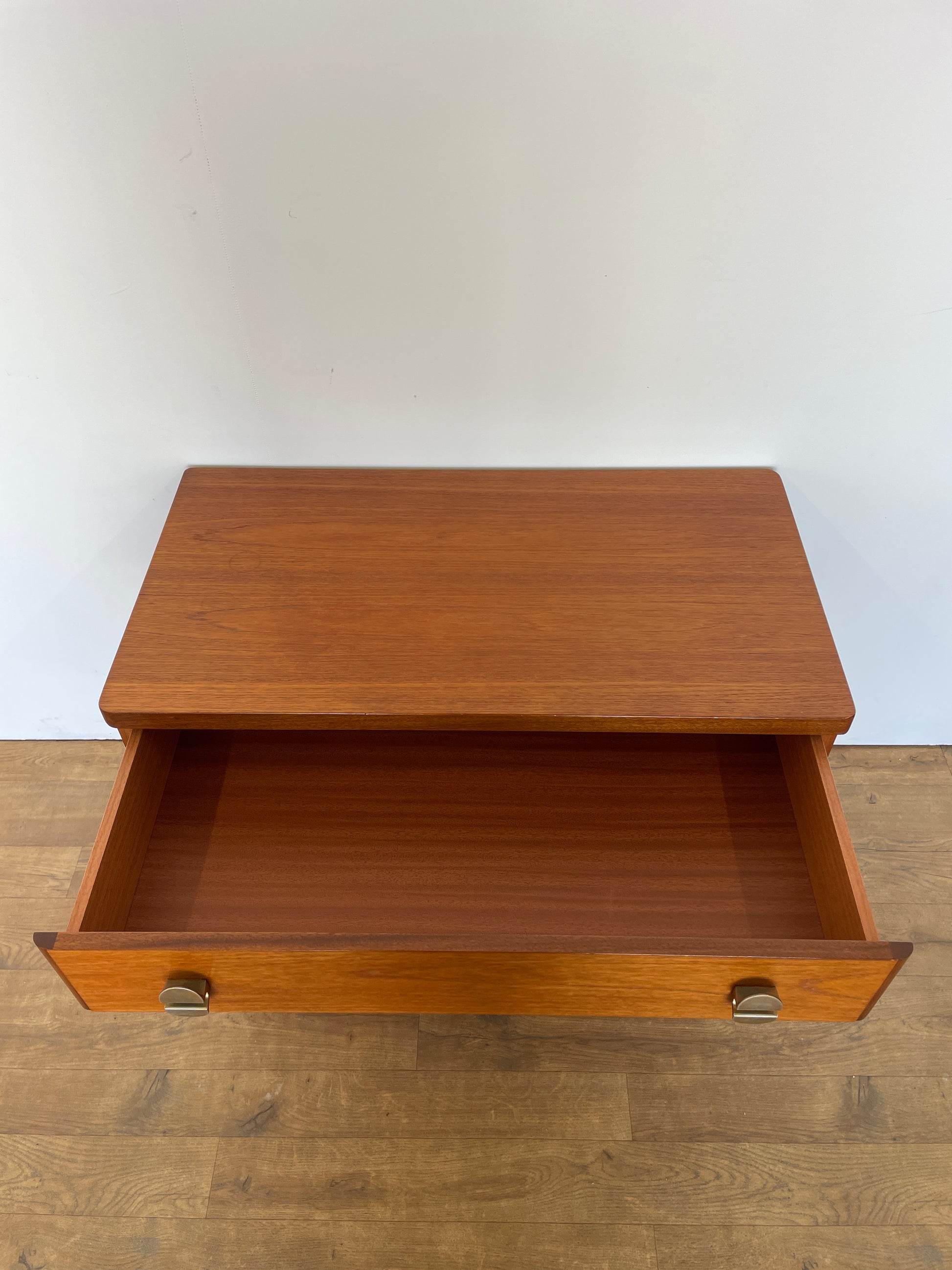 Add timeless character and authentic retro charm to your home with this beautiful Mid-Century Modern teak Stag chest of drawers. Expertly crafted with clean lines, warm teak woodgrain and original metal handles, this classic 3-drawer storage unit embodies iconic mid-century British design. Ideal for bedrooms, living rooms, or stylish hallways, it offers practical storage with three spacious drawers, while the sleek silhouette makes it a perfect fit for modern, vintage, or Scandinavian interiors. Measuring 82 cm wide × 44 cm deep × 64 cm high, this vintage Stag chest of drawers provides excellent functionality and design appeal. Whether used as a statement piece, dressing table, or storage cabinet, it’s a timeless investment for mid-century furniture lovers. The sturdy construction and elegant detailing reflect quality craftsmanship from a celebrated British furniture brand. A must-have for collectors or anyone looking to elevate their space with genuine mid-century style.