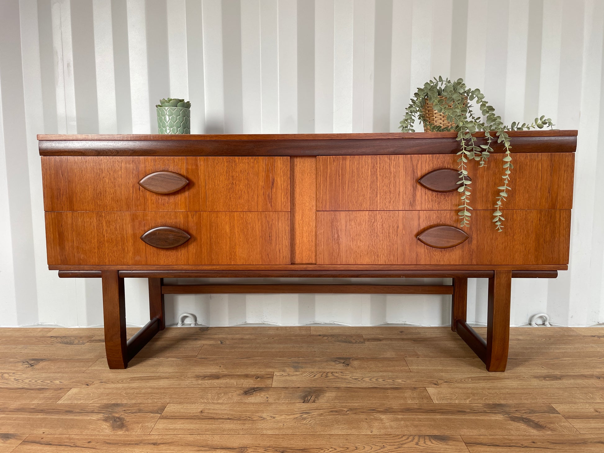 Add a touch of vintage charm to your living space with this beautiful mid-century modern sideboard. Crafted from high-quality teak, this freestanding piece features four spacious drawers, perfect for storing all your TV and media essentials. The brown colour and wooden handles add a touch of warmth to any room, making it a versatile addition to your home.