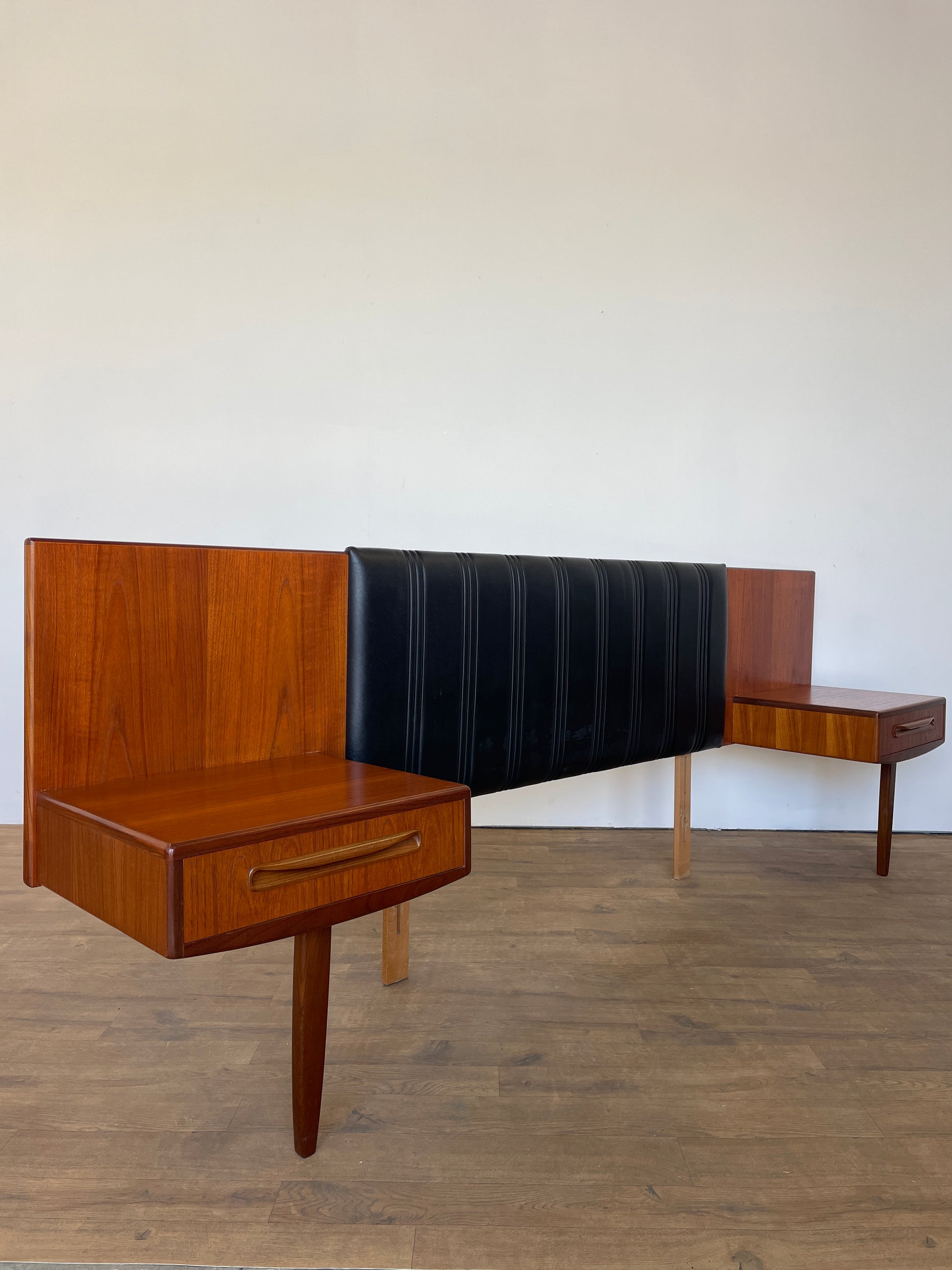 This striking mid-century G Plan Fresco headboard combines elegant teak craftsmanship with sleek black vinyl upholstery to create a timeless bedroom statement. Designed for a UK king-size bed (150 cm gap), it features integrated bedside cabinets with signature sculpted handles and tapered legs. A beautiful example of 1960s British modern design, this piece blends practicality with sophisticated style, offering both comfort and storage in one elegant structure. The teak panels showcase a warm grain that contrasts perfectly with the upholstered centre section, while the compact drawers provide ideal space for night-time essentials. Perfect for collectors, enthusiasts, or anyone looking to elevate a vintage or contemporary interior. G Plan’s renowned build quality ensures this headboard remains both sturdy and stylish for decades to come.
