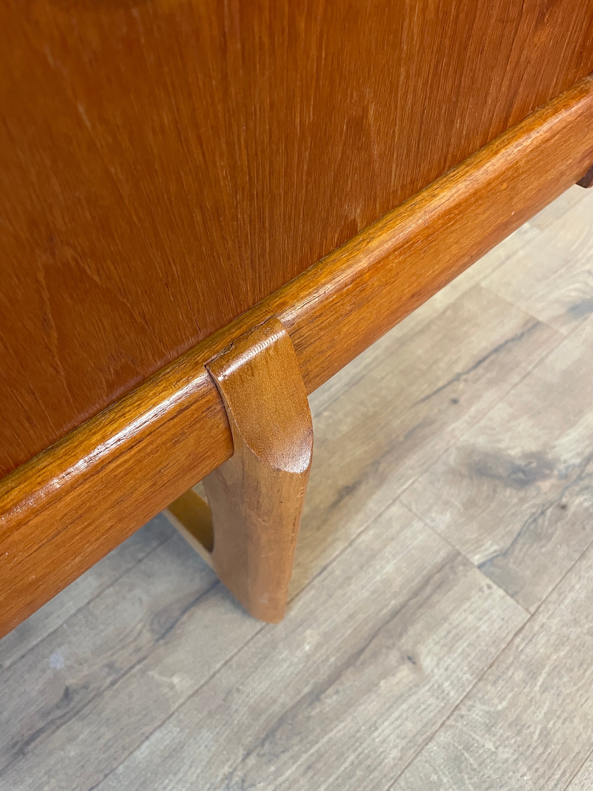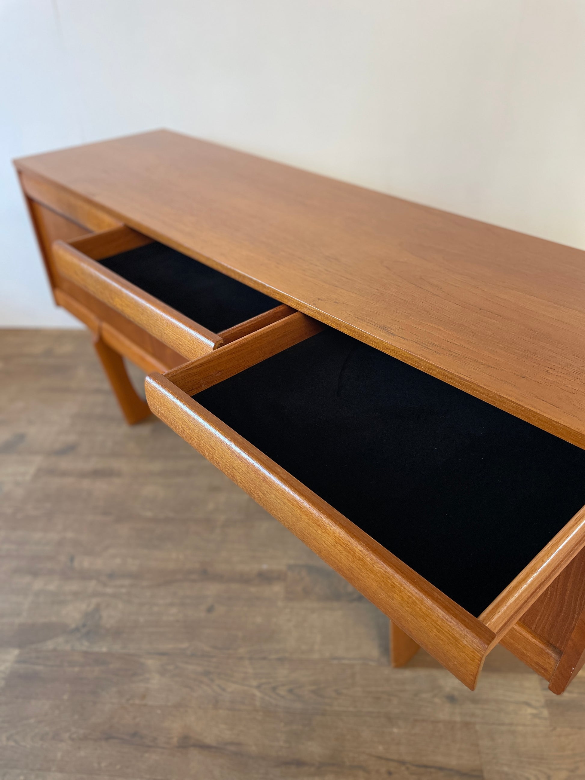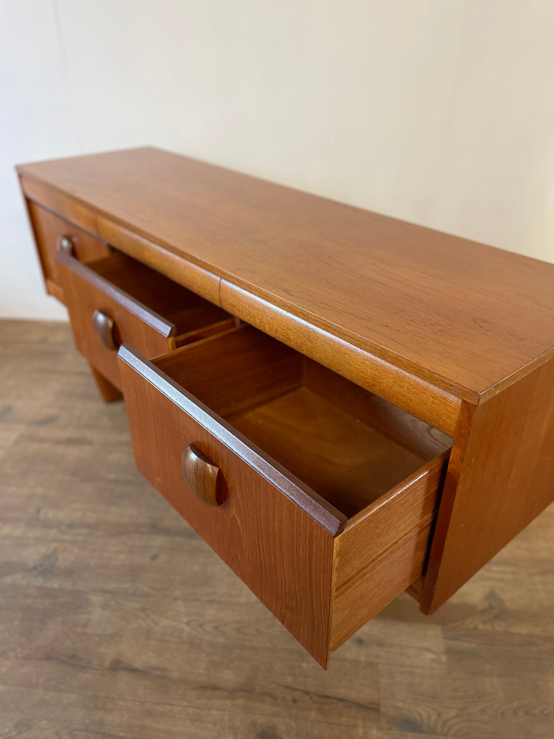 This beautifully crafted mid-century teak sideboard by Elliotts of Newbury captures the refined elegance of 1960s British furniture design. At 153cm long, it offers generous storage within a compact footprint, making it ideal for modern homes that appreciate authentic vintage character. The warm teak grain, solid craftsmanship, and signature sculpted handles highlight the exceptional quality for which Elliotts of Newbury became known. Elevated on distinctive arch-shaped legs, the piece feels light, balanced, and effortlessly stylish — perfect for adding timeless charm to a living room, dining space, hallway, or contemporary interior. With six smooth-gliding drawers and ample cupboard storage, it is as functional as it is beautifully designed. Ready to use, this original mid-century sideboard brings together British heritage, practicality, and classic Scandinavian-influenced styling. A standout investment piece for any collector or lover of vintage furniture.