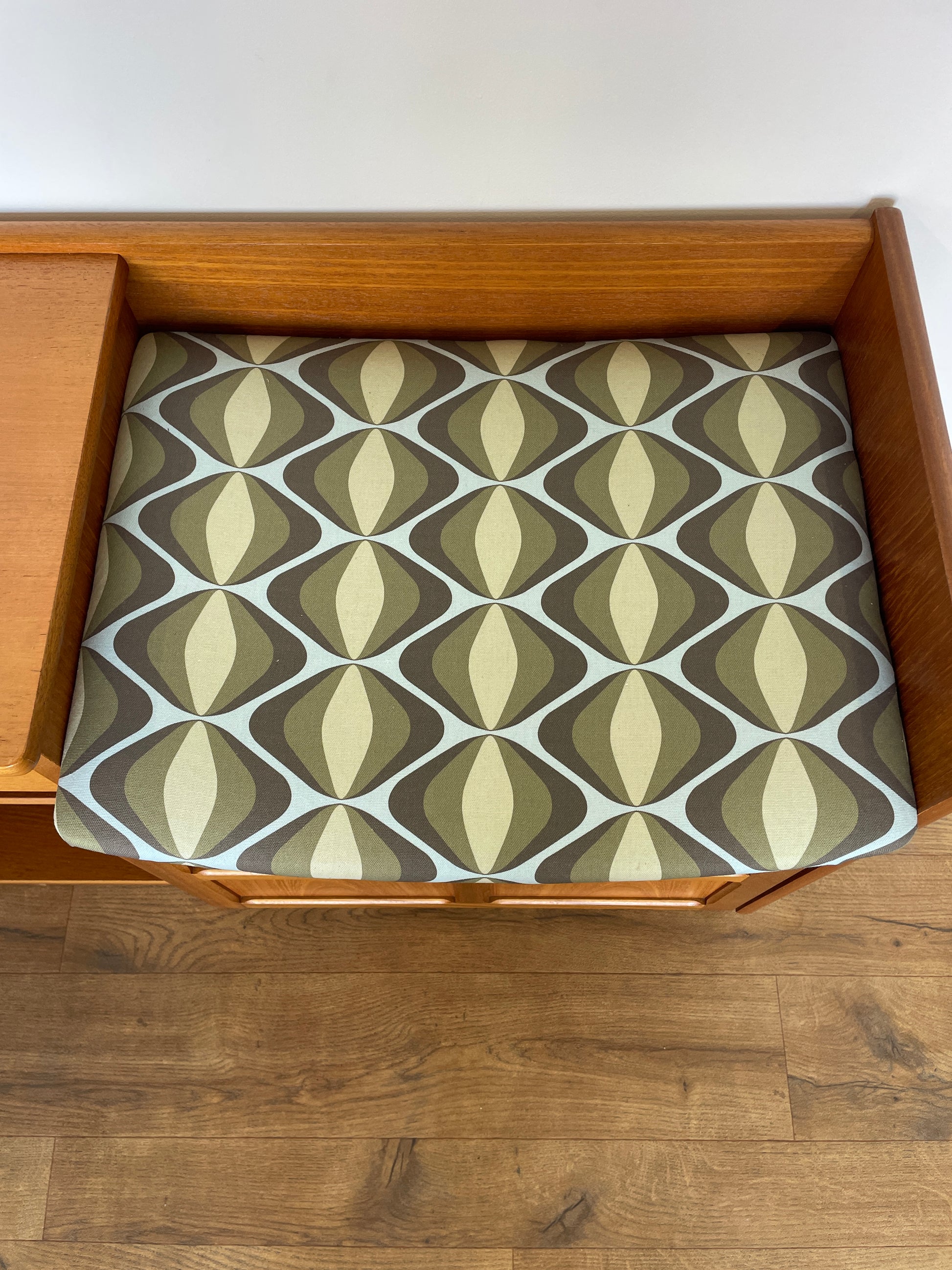 The cushioned seat has been reupholstered in a retro geometric fabric in olive, cream, and greem tones—adding a bold, vintage-inspired flair. Whether used as a hallway perch, a compact reading nook, a shoe holder, or simply a nostalgic decor piece, this seat offers both style and function.