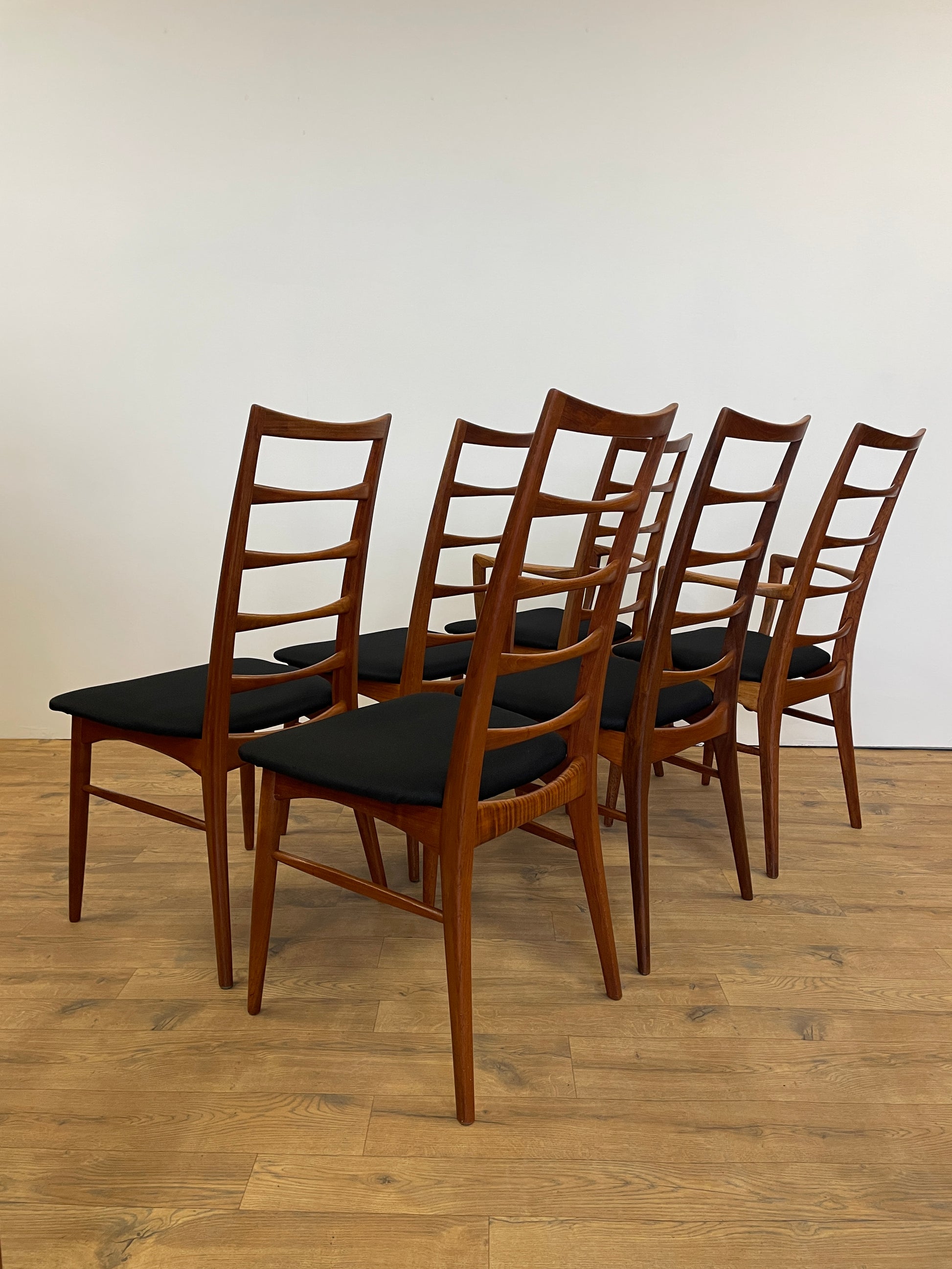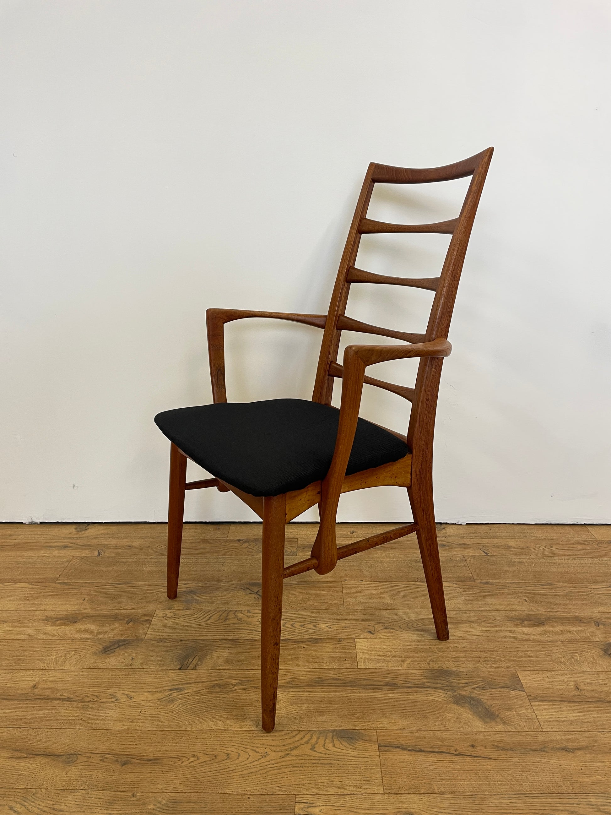 Designed by the renowned Niels Koefoed, this extremely rare and stylish set of six Danish dining chairs (including two carvers) exudes the quintessential mid-century modern style, seamlessly blending functionality with elegant design. They were designed by Niels Koefoed and made in Denmark by Koefoed Hornslet in the 1960s, this model is called the ‘Lis’ chair.
