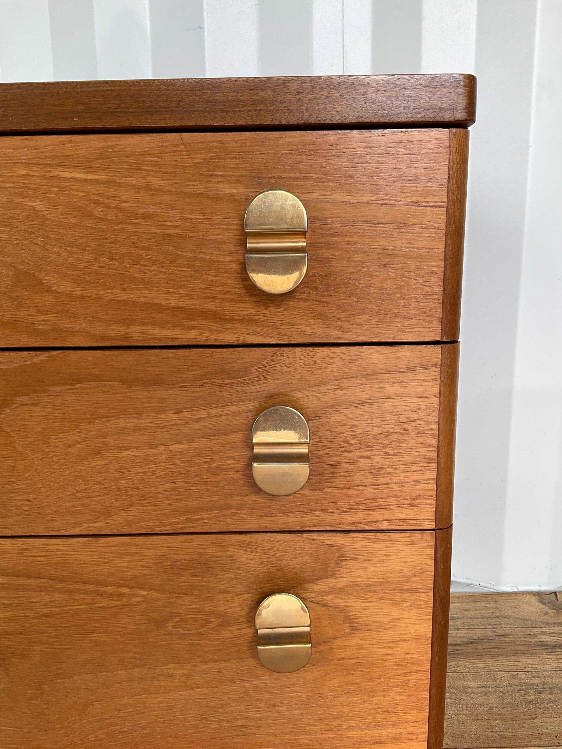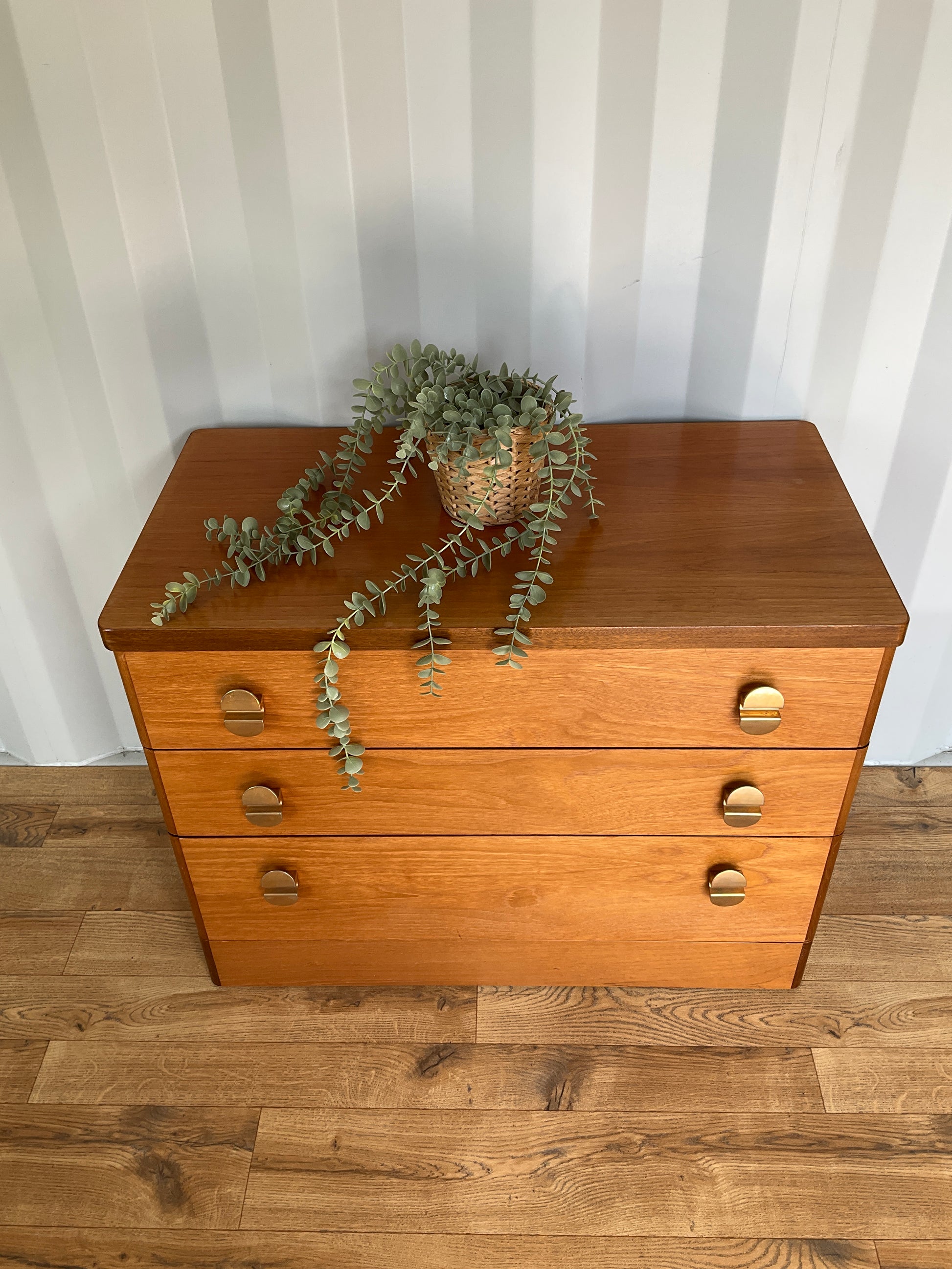 Introducing a stunning vintage chest of drawers from Stag Furniture, perfect for any mid-century modern style home. Crafted from beautiful teak wood with a medium wood tone, this free-standing chest features t brass handles and three drawers.