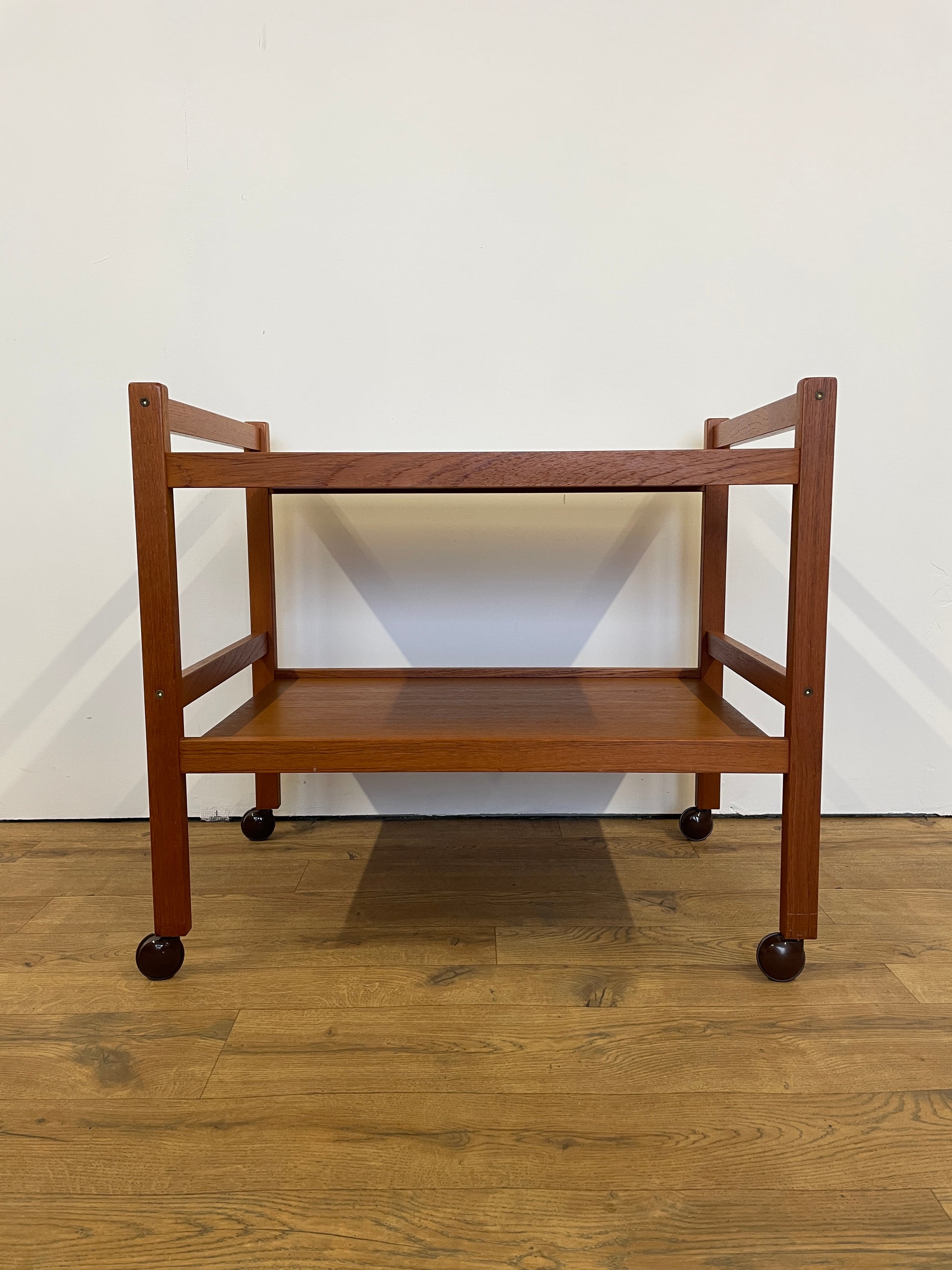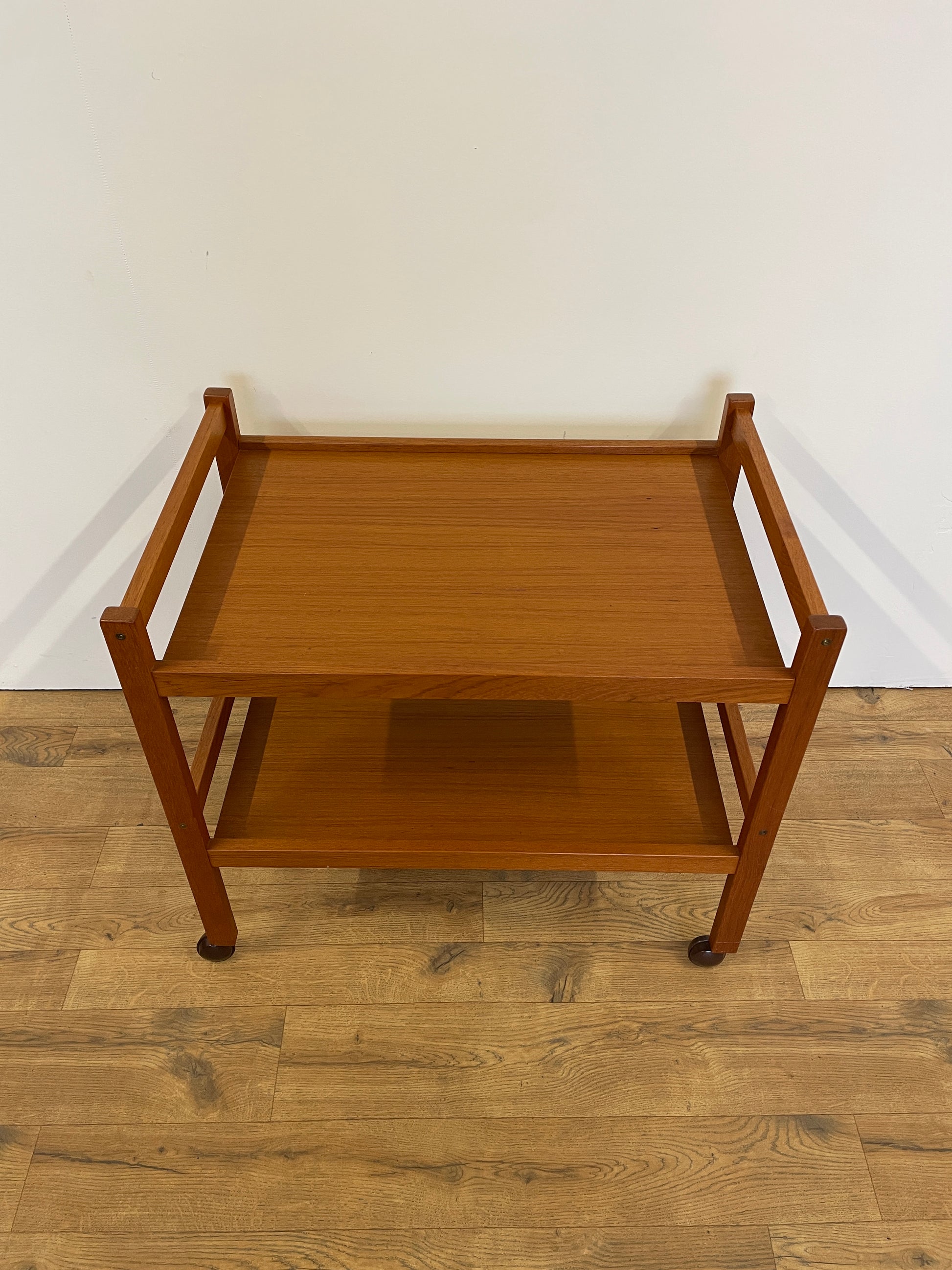 This Danish mid-century drinks trolley is crafted from teak wood, it features two wooden shelves,