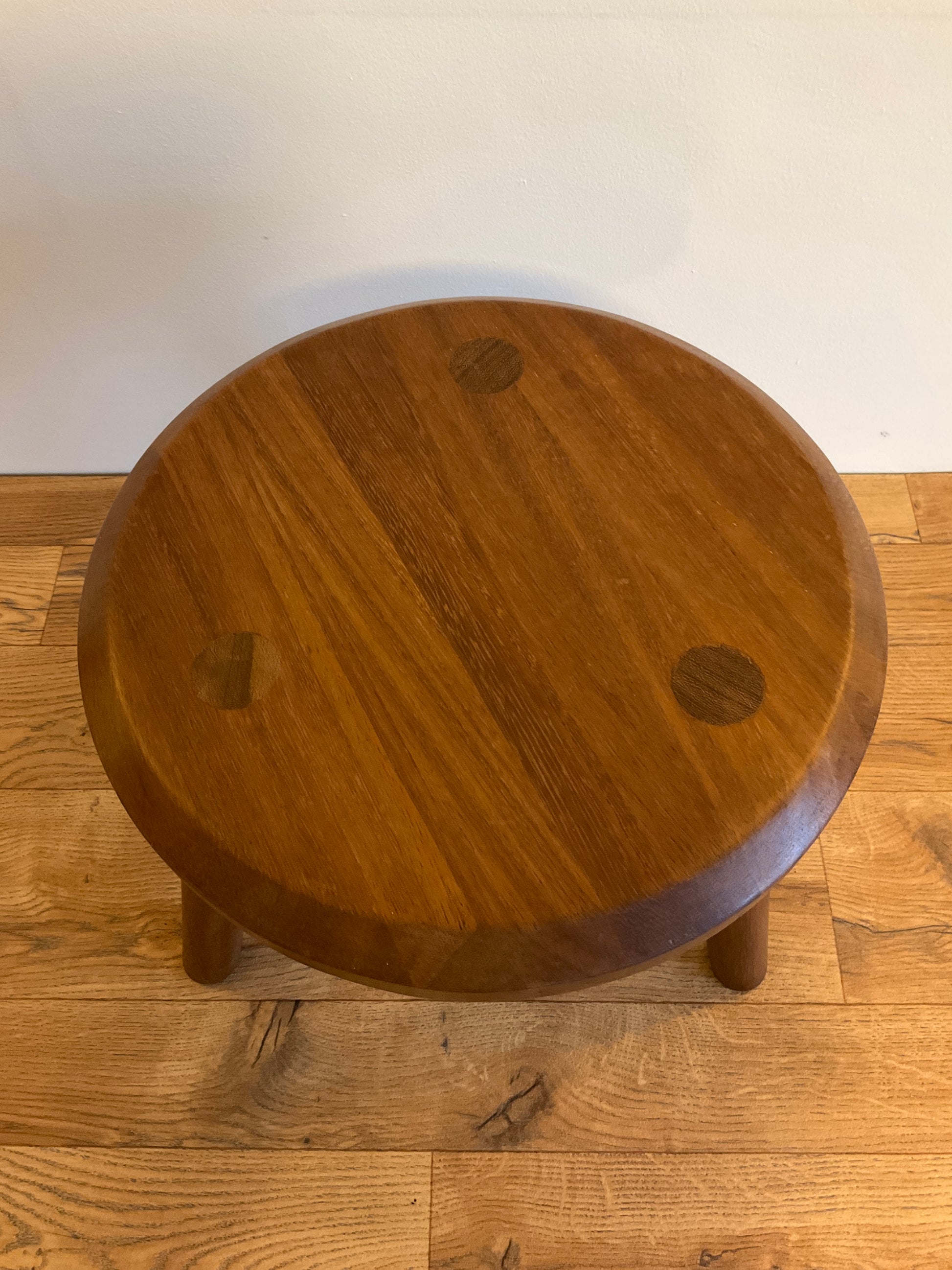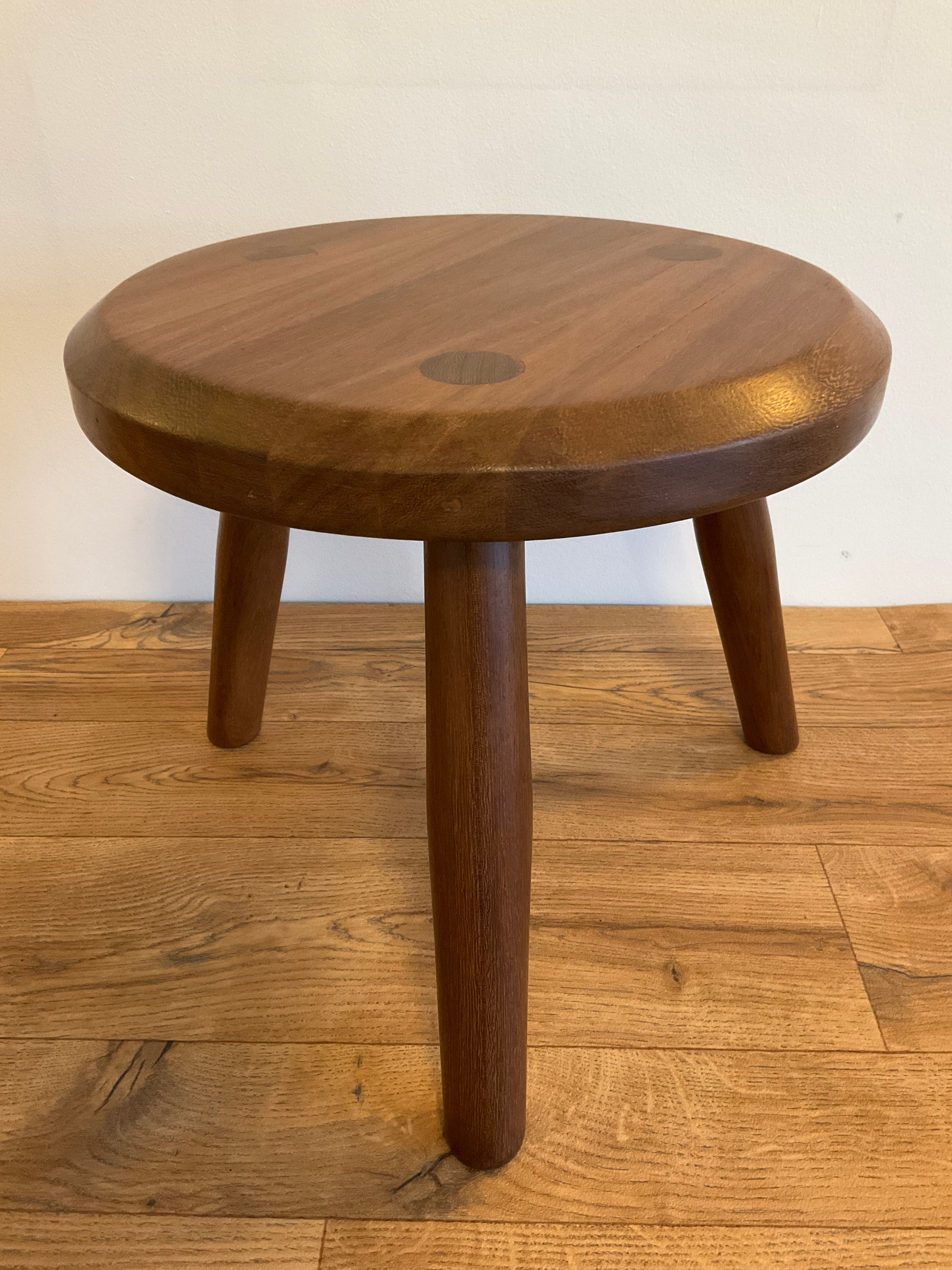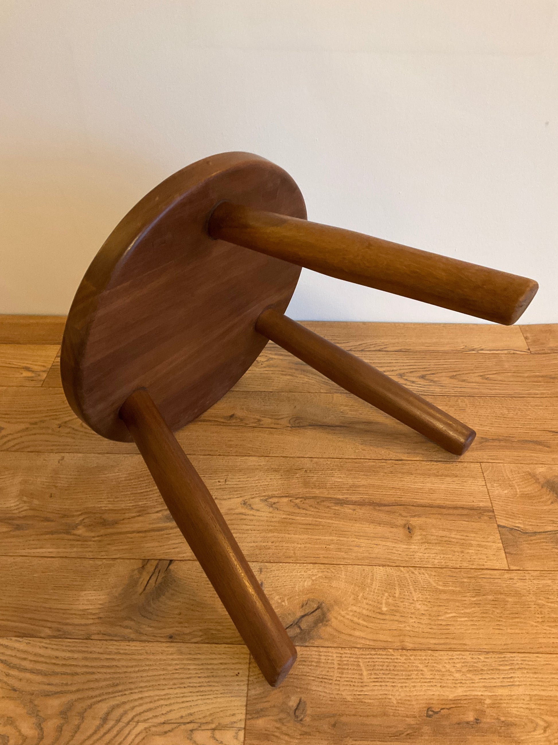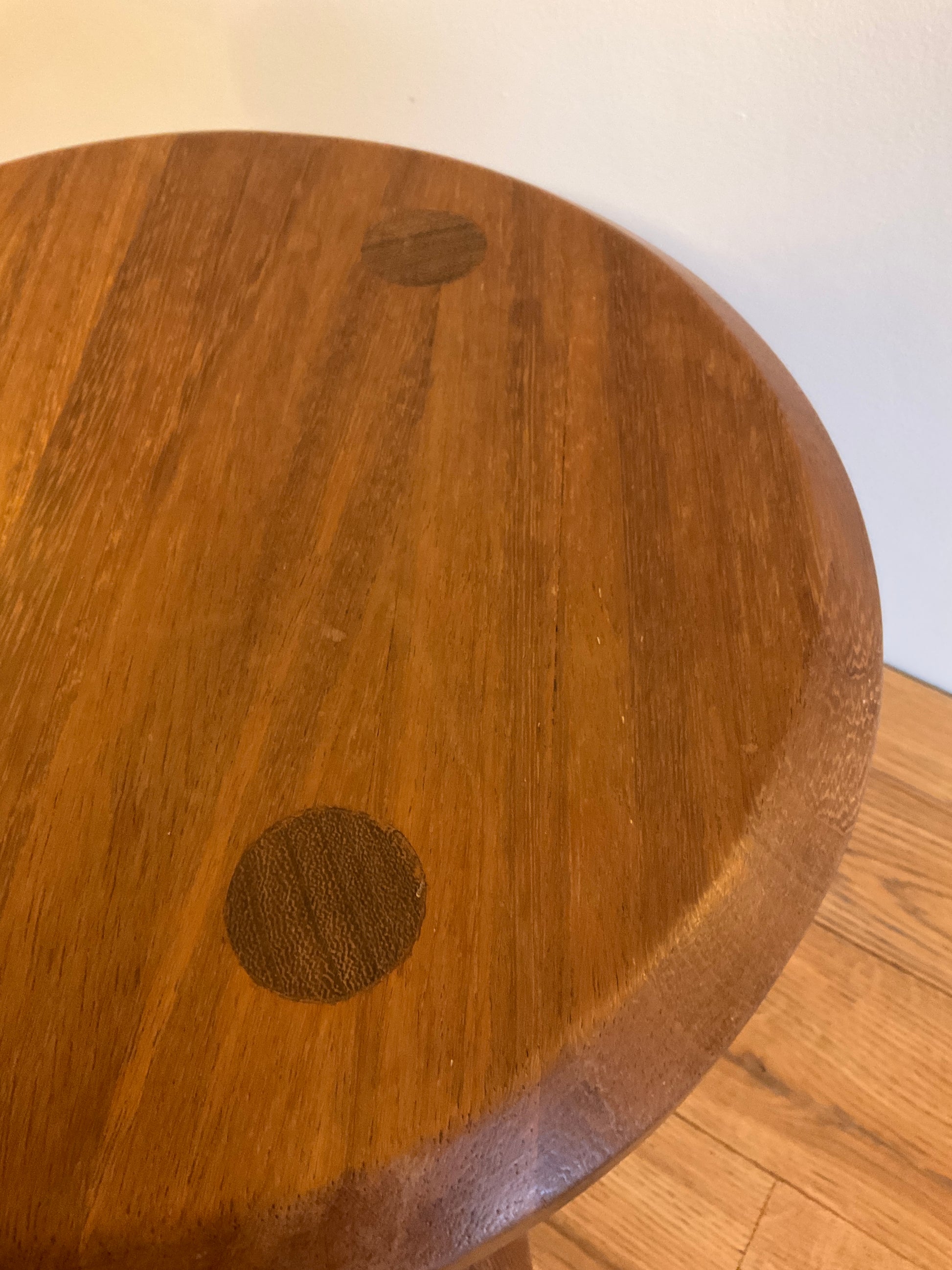 The circular seat features visible darker wood plugs, celebrating its honest construction and craftsmanship. The thick, tapered legs provide excellent stability while maintaining that clean Scandinavian-influenced silhouette so popular in 1960s and 1970s interiors.
