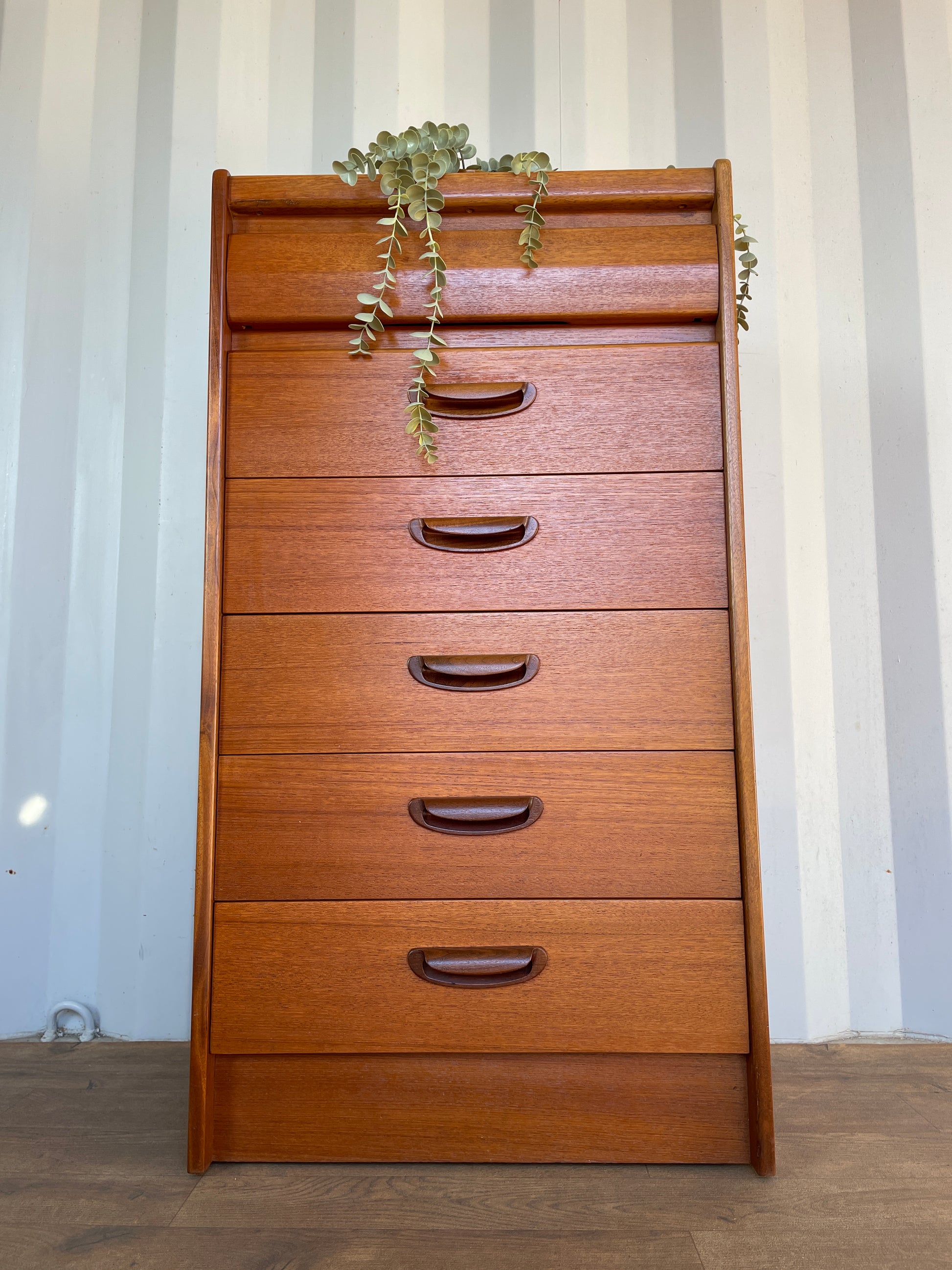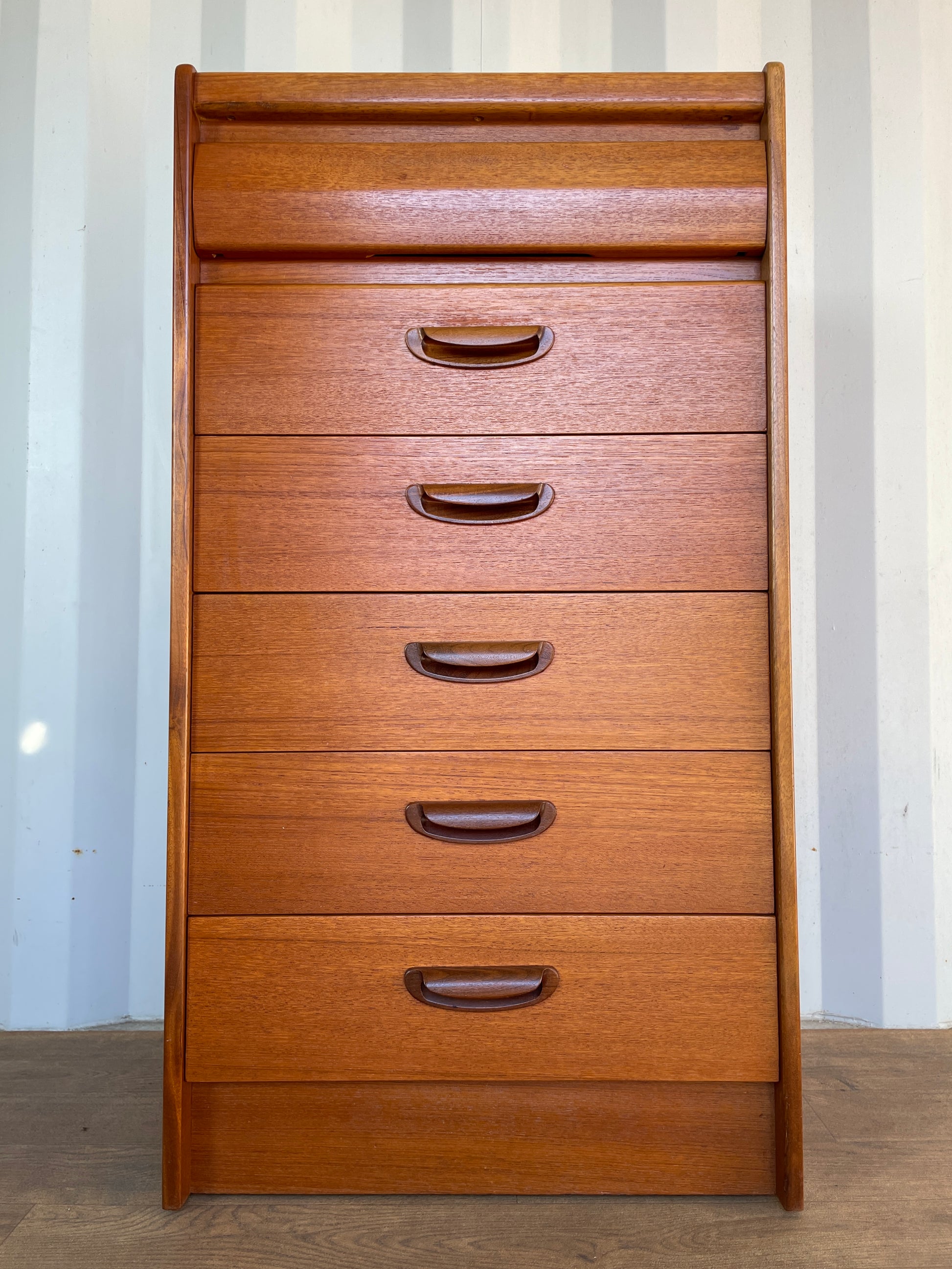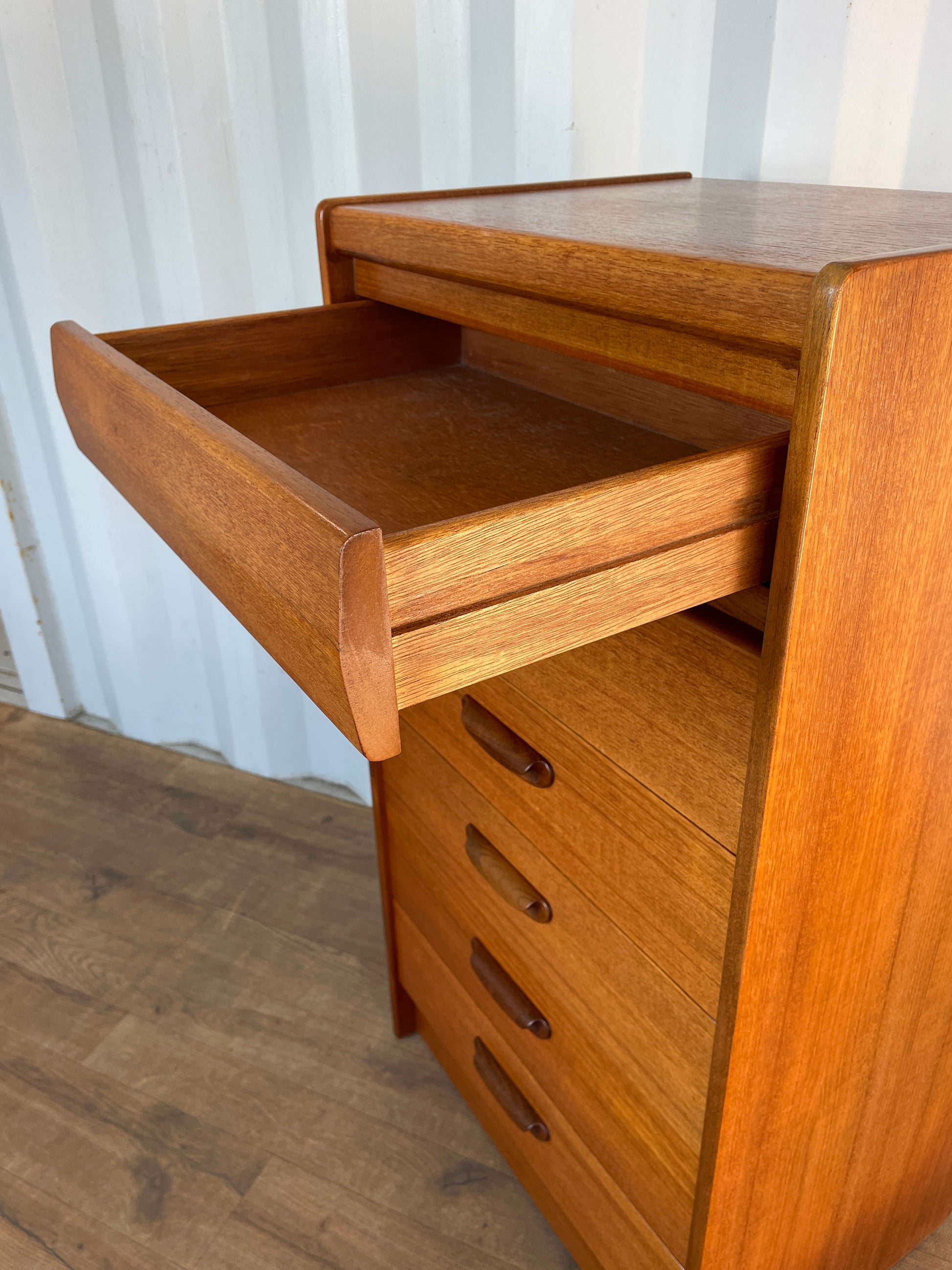 A beautifully proportioned vintage mid-century tall chest of drawers by William Lawrence, crafted in warm-toned teak with elegant sculpted handles and softly rounded edges. This refined British modernist design offers five generously sized drawers, each gliding smoothly and providing practical storage within a compact footprint.